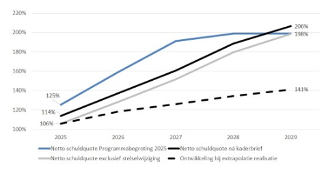 Ten opzichte van de prognose bij de Programmabegroting 2025 zorgt de stelselwijziging rondom de afkoopsommen erfpacht voor een verhoging van de schuldquote. Deze middelen stonden tot vorig jaar als eigen vermogen op de balans, maar worden nu als schuld op de balans verantwoord. Dit is geen 'schuld' waartegenover een renterisico staat, maar schuld in de zin van een toekomstige verplichting door het gebruik van erfpachtgrond. Exclusief deze stelselwijziging zou de netto schuldquote in 2029 met 198% (grijze lijn) ongeveer gelijk zijn aan de prognose bij de Programmabegroting 2025.